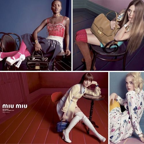 Ο λόγος για τον Miu Miu, που μετά τις Léa Seydoux και Adele Exarchopoulous που πρωταγωνίστησαν στην resort καμπάνια του, στράφηκε πάλι στο χώρο του κινηματογράφου για να βρει τις μούσες του για την ανοιξιάτικη σεζόν. Οι Elle Fanning, Lupita Nyong'o, Elizabeth Olsen και Bella Heathcote πόζαραν στο φακό των Inez van Lamsweerde και Vinoodh Matadin φορώντας τις νέες Miu Miu δημιουργίες και το αποτέλεσμα είναι κάτι περισσότερο από υπέροχο. Σε ένα σκηνικό που μας θύμισε το στήσιμο της χειμωνιάτικης 2007 Miu Miu καμπάνιας με την Laetitia Casta πρωταγωνίστρια, τα τέσσερα κορίτσια φόρεσαν τις παστέλ κοριτσίστικες Miu Miu αποχρώσεις περισσότερο ως it girls παρά ως ενζενί σε μια από τις ωραιότερες φετινές καμπάνιες.