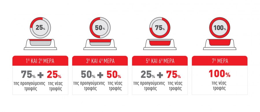 Η διαδικασία αλλαγής της τροφής του σκύλου μας θα πρέπει να γίνεται ομαλά και σταδιακά, ώστε να μην παρουσιάσει στομαχικές διαταραχές. Η ιδανική μετάβαση από την παλιά στη νέα τροφή μπορεί να πραγματοποιηθεί σταδιακά, αναμιγνύοντας και τις δύο τροφές. Αρχικά, μπορείτε να εισάγετε τη νέα τροφή, δίνοντας στον σκύλο σας 3/4 από την παλιά τροφή και 1/4 από τη νέα. Στη συνέχεια, αυξάνετε τη νέα τροφή, μειώνοντας την παλιά, δίνοντάς του μισή από την παλιά και μισή από τη νέα τροφή. Τις επόμενες μέρες, αναμιγνύετε 3/4 της νέας τροφής με 1/4 της παλιάς τροφής, μέχρι να φτάσετε στο 100% της νέας τροφής.
