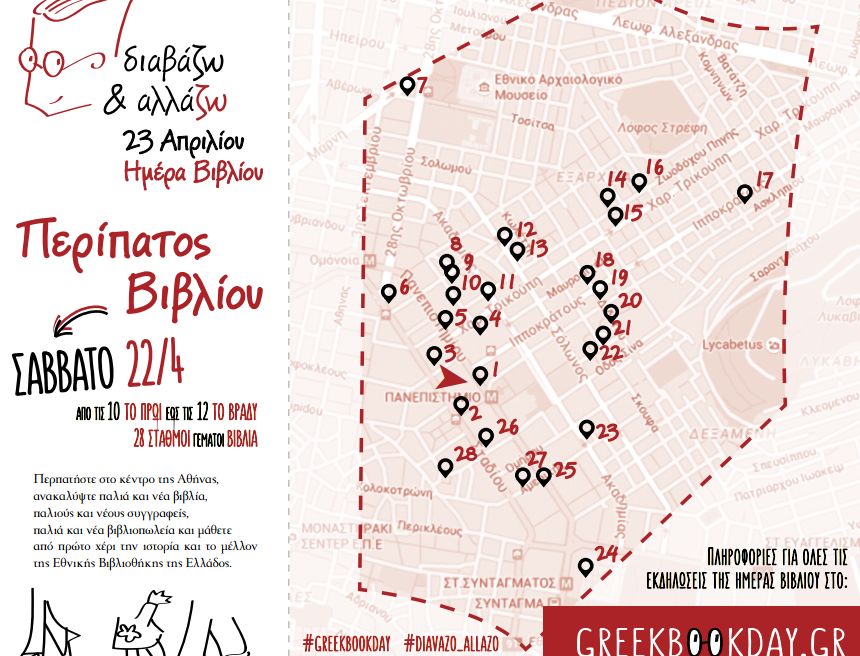Τι μπορείς να κάνεις, λοιπόν, στην Αθήνα; Το Σάββατο 22 Απριλίου, στο πλαίσιο των εορτασμών της Ημέρας Βιβλίου, η Ένωση Ελληνικού Βιβλίου, σε συνεργασία με τη Εταιρεία Συγγραφέων και του Ελληνικού Τμήματος της ΙΒΒΥ, διοργανώνει έναν μεγάλο Περίπατο Βιβλίου στο κέντρο της Αθήνας.