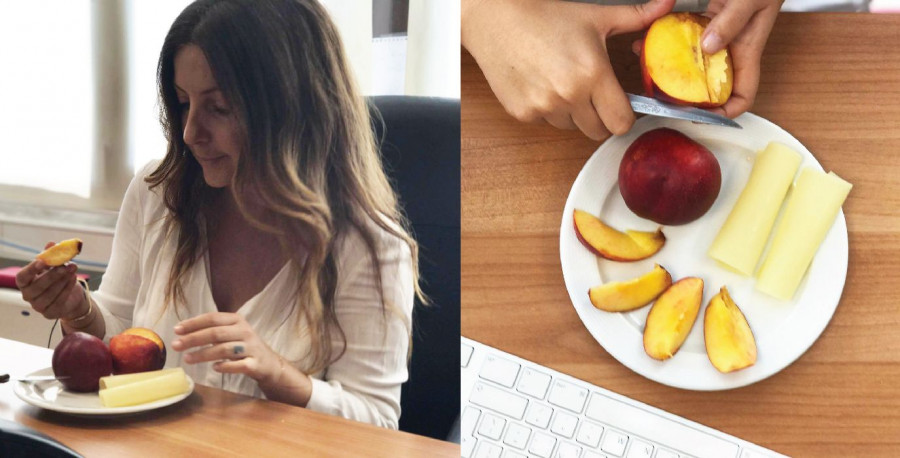 - Φυσικά, δεν ξεχνώ να πάρω τα φρουτάκια μου. Άλλωστε τώρα το Καλοκαίρι οι επιλογές είναι πολλές. Ετοιμάζω, λοιπόν, από το σπίτι μια φρουτοσαλάτα και την κρατώ δροσερή στο ψυγείο του γραφείου.