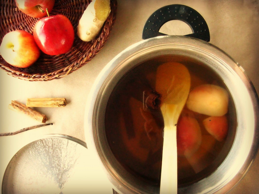 Γεμίζεις ένα μικρό κατσαρολάκι μέχρι τη μέση νερό. Ρίχνεις το μήλο που έχεις ψιλοκόψει σε φέτες, τα μπαχάρια και το τζίντζερ το οποίο θα το έχεις τρίψει νωρίτερα. Βράζεις το νερό σε χαμηλή φωτιά ενώ σταδιακά εκείνο θα αρχίσει να παίρνει ένα ελαφρώς καφέ χρώμα. Στο σημείο αυτό, μπορείς να αδειάσεις το νερό σε ένα τσαγιερό και να το σερβίρεις προσθέτοντας στην κάθε κούπα από μία κουταλιά μέλι.