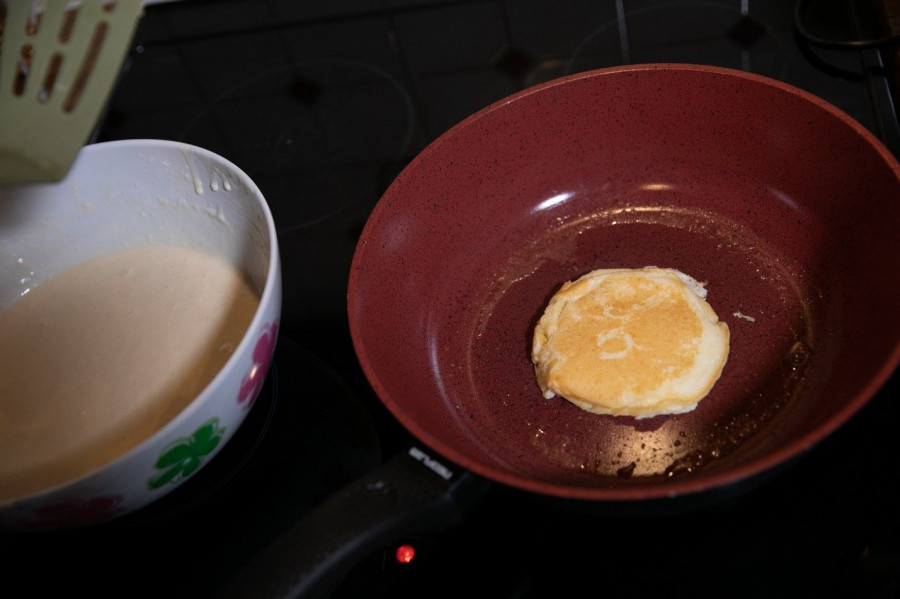 Θα γεμίσεις ένα φλιτζανάκι του τσαγιού (το οποίο το χρησιμοποιείς ως πρόχειρη μεζούρα) με το μίγμα και έπειτα θα το αδειάσεις προσεχτικά στο τηγάνι σου. Θα περιμένεις λίγα λεπτά να ψηθεί η μία πλευρά και μόλις δεις φουσκάλες στην επιφάνεια του pancake, το γυρίζεις αμέσως από την ανάποδη.