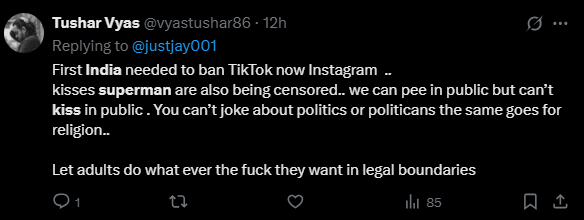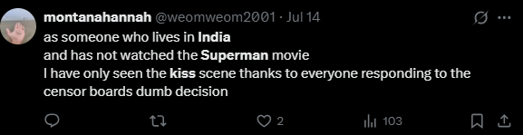 Ένας άλλος σχολίασε: «Άρα, ο Superman ΔΕΝ επιτρέπεται να φιλήσει τη Lois Lane στις ινδικές οθόνες. Αλλά όλοι οι γελοίοι πρωταγωνιστές των ινδικών ταινιών μπορούν να τραβούν, να χουφτώνουν, να παρενοχλούν, να καταδιώκουν, να χαστουκίζουν και να κάνουν ό,τι θέλουν στις ηρωίδες τους. Σοβαρολογείτε, ινδικό συμβούλιο λογοκρισίας;».