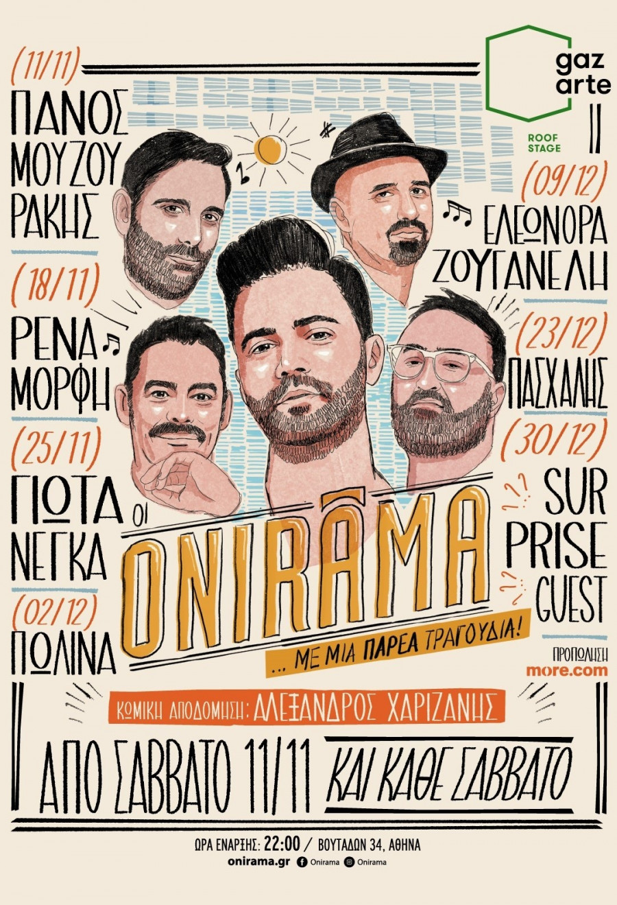 Οι ONIRAMA, το συγκρότημα με τις περισσότερες συνεργασίες τόσο δισκογραφικά, όσο και on stage, φέτος το χειμώνα θα μοιράζονται τη σκηνή του Gazarte Roof Stage με έναν διαφορετικό καλεσμένο κάθε εβδομάδα. Εκλεκτοί φίλοι, θα συναντηθούν μαζί τους χαρίζοντάς μας μοναδικά ταξίδια στον κόσμο της μουσικής: Η αυλαία ανοίγει το Σάββατο 11 Νοεμβρίου με τον Πάνο Μουζουράκη που θα ενώσει τη φωνή και την τρέλα του με τους ONIRAMA, δίνοντας το έναυσμα για μια σειρά ξεχωριστών συναντήσεων. Ακολουθούν οι: