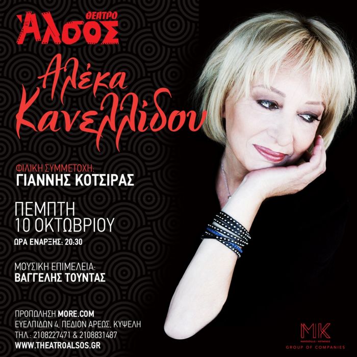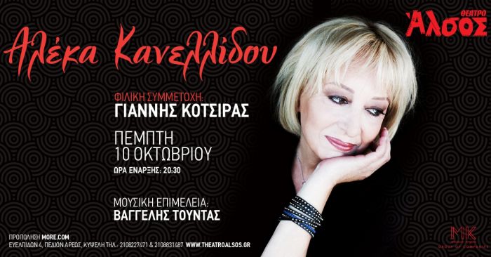 Η μεγάλη κυρία του ελληνικού τραγουδιού Αλέκα Κανελλίδου έρχεται για μια ξεχωριστή εμφάνιση στο Θέατρο Άλσος, την Πέμπτη 10 Οκτωβρίου με καλεσμένο της τον Γιάννη Κότσιρα.