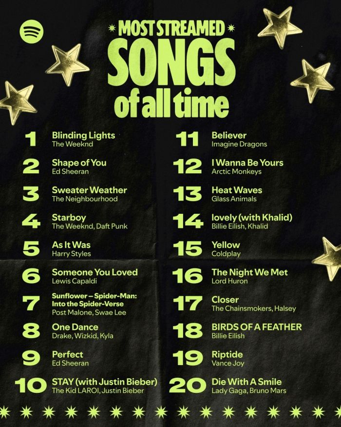 Στα τραγούδια, την κορυφή κατακτά ο The Weeknd με το «Blinding Lights», το οποίο παραμένει το πιο streamed κομμάτι στην ιστορία της πλατφόρμας.