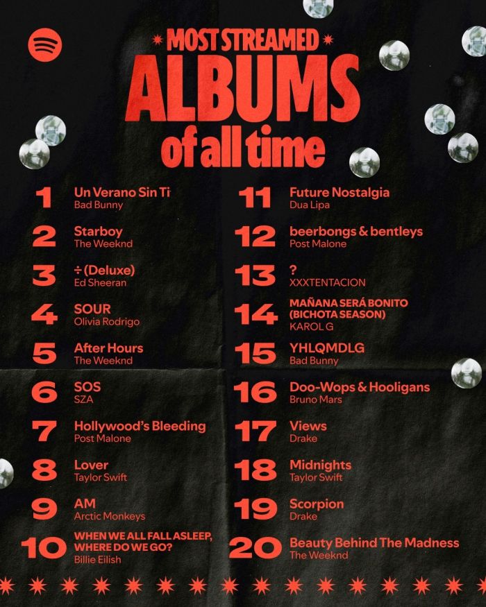 Στην κατηγορία των άλμπουμ, την πρωτιά κατακτά ο Bad Bunny με το «Un Verano Sin Ti» (2022), το οποίο αποτελεί το πιο streamed άλμπουμ όλων των εποχών στο Spotify. Η επιτυχία του δεν είναι τυχαία, καθώς το άλμπουμ συνδύασε εμπορική απήχηση, viral δυναμική και συνεχή παρουσία στα charts, επιβεβαιώνοντας τη δύναμη της latin μουσικής σε παγκόσμιο επίπεδο. Εξάλλου, η επιτυχία της εμφάνισής του στο Super Βowl μόνο τυχαία δεν είναι.