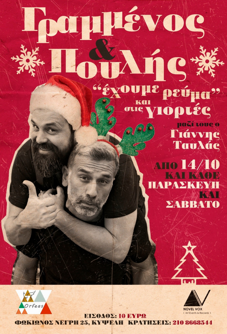 Ο Σπύρος Γραμμένος και ο Κωνσταντίνος Πουλής συνεχίζουν τις απόλυτα επιτυχημένες παραστάσεις τους με τίτλο «Έχουμε ρεύμα»! Και επειδή τίποτα δεν είναι πλέον δεδομένο συνεχίζουν όλο τον Δεκέμβριο μέχρι και τις αρχές Ιανουαρίου γιατί «Έχουμε ρεύμα και στις γιορτές»!