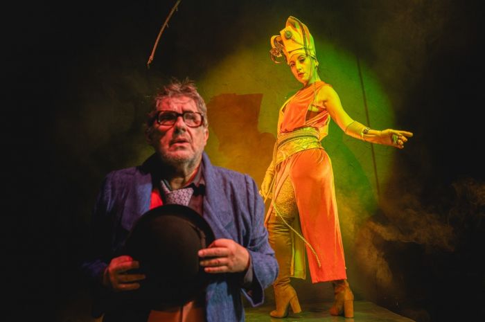 Η σκηνή γίνεται ένα θέατρο μέσα στο θέατρο, γεμάτο μπαούλα, βαλίτσες, ερείπια θεατρικών εποχών και φωτισμούς που δραπετεύουν από τον ρεαλισμό.