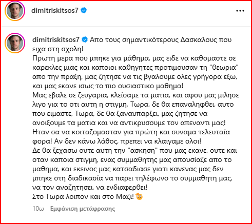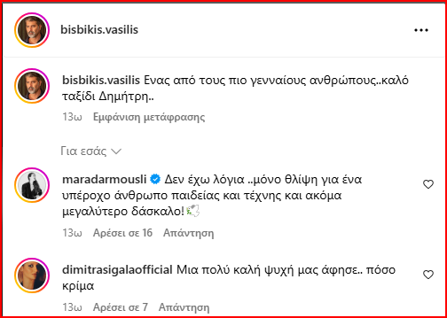 Τρυφερό ήταν και το μήνυμα της Δανάης Παππά στον αγαπημένο της συνεργάτη και δάσκαλο για τους νεότερους ηθοποιούς. Γράφοντας μεταξύ άλλων στην ανάρτησή της: «Δεν ξέρω τί να πω. Δημήτρη μου θα μου λείψεις, πολύ. Μας αγκάλιασες, μας έκανες να γελάσουμε, να συγκινηθούμε. Θα κρατώ τις στιγμές που βρεθήκαμε, μπροστά και πίσω από την κάμερα, σαν φυλακτό. Ήσουν, είσαι και θα είσαι υπέροχος. Συλλυπητήρια στην οικογένεια. Το σώμα μόνο φθείρεται. Η ψυχή είναι αθάνατη»