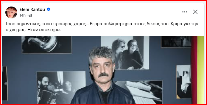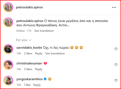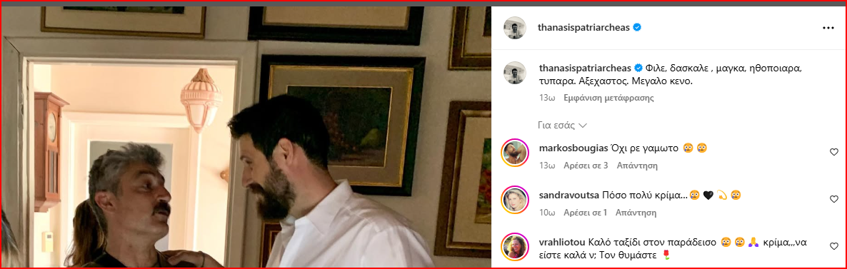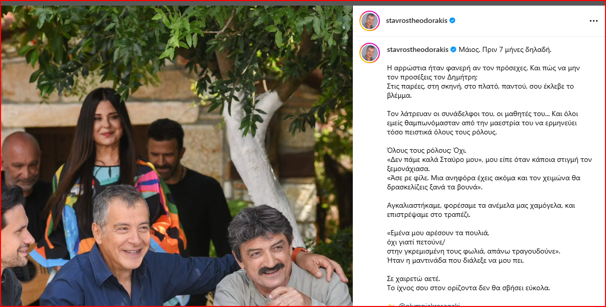 Συγκινημένος και ο Γιώργος Γεροντιδάκης που δούλεψε μαζί του τα τελευταία δύο χρόνια: «Αντίο φίλε μου. Οι ρόλοι μπορεί να ανταλλάσσουν λόγια για τον σκοπό μιας καθημερινής δουλειάς. Αλλά οι ανθρώπινες ματιές είναι εκείνες που μένουν για πάντα