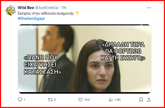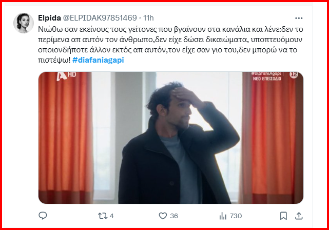 Σήμερα έχουμε το φινάλε του πρώτου κύκλου στη Διάφανη Αγάπη και η μεγάλη έκπληξη με την αποκάλυψη του δολοφόνου, δίνει τη θέση της στη δικαίωση και την τιμωρία. Μπορεί το Χ να θύμωσε με τον Νίκο Ραγκούση, αλλά αναγνώρισε το μεγάλο ταλέντο του Νίκου Ψαρρά, ο οποίος πάντα μας εκπλήσσει όταν χρειάζεται να υποδυθεί τους δύσκολους ρόλους.
