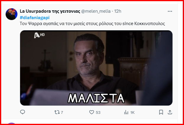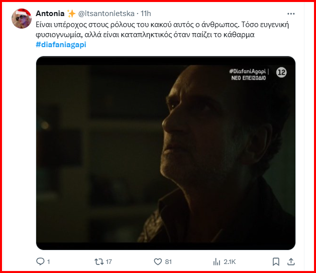 Φυσικά μόνο ο Νίκος Ψαρράς θα μπορούσε να υποδυθεί με ακρίβεια και τόσο ρεαλιστικά τον ρόλο του ανθρώπου που πρόδωσε τον καλύτερό του φίλο. Γιατί εδώ και 9 επεισόδια μας είχε δείξει ένα άλλο προφίλ, μέχρι χθες που αποκαλύφθηκε ο σκοπός του και η δολοπλοκία που οδήγησε στον θάνατο. Μας θύμισε ξανά ο ηθοποιός τους ρόλους στον Κόκκινο Κύκλο. Το κοινό εν μέρει διχάστηκε.