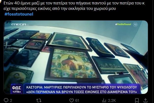 «Όσες φορές τον είχα δει ήταν μαζί με τον μπαμπά του. Μένανε μαζί στο διαμέρισμα. Ήταν ένας ιδιαίτερα ευγενέστατος κύριος. Μας είχε πει ότι ο γιος του εργαζόταν στη Σάμο για χρόνια και ότι τέλη Οκτώβρη είχε έρθει Καστοριά και τους φάνηκε η πόλη έρημη. Δεν ήθελε με τίποτα να πάει ο γιος του στο Νεστόριο όπου είχε διοριστεί, αν και του εξηγούσα ότι πρόκειται για ένα πολύ όμορφο χωριό και έτσι αποφάσισαν να μείνει στην πόλη», λέει χαρακτηριστικά.