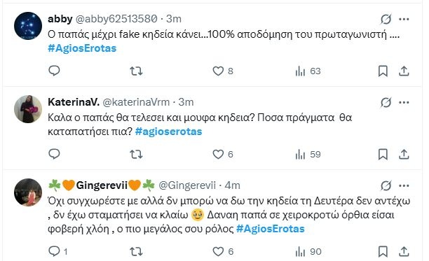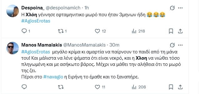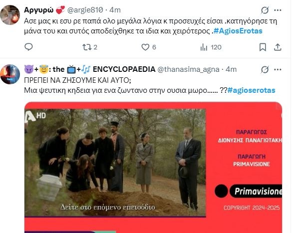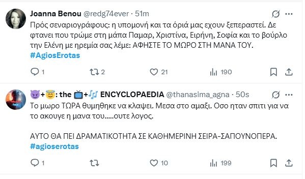 Όλοι στάθηκαν στο πλευρό της μάνας που μαθαίνει πως χάθηκε το παιδί της και τη συμπόνεσαν στην πλεκτάνη που στήθηκε εν αγνοία της. Η Δανάη Παππά υποστήριξε άψογα την ηρωίδα της και ήταν μία από τις καλύτερες στιγμές της υποκριτικά στη σειρά. Και έπεται και συνέχεια, με την κηδεία του μωρού της τη Δευτέρα.