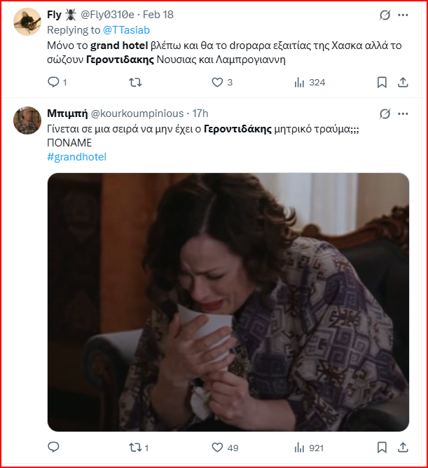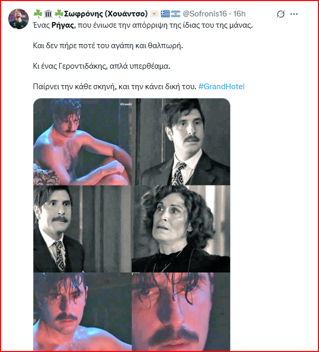 Ο Γιώργος Γεροντιδάκης ήταν το πρόσωπο του χθεσινού επεισοδίου, κυρίως για εκείη τη συγκλονιστική σκηνή, όπου μόνος του στο πάτωμα θρηνεί τη χαμένη του μητέρα, παρόλο που εκείνη τον είχε εγκαταλείψει όταν ήταν μικρός, κάνοντας ωστόσο προσπάθειες να τα ξαναβρούν. Το κοινό θαύμασε για μία ακόμη φορά το ταλέντο του ηθοποιού.