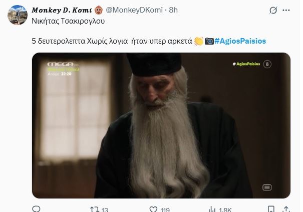 Το χθεσινό και προτελευταίο επεισόδιο ήταν ίσως το πιο συγκινητικό και το πιο καθηλωτικό. Από πλευράς περιεχομένου γιατί περάσαμε σε μία άλλη πλευρά του Αγίου με τα θαύματα του και από καλλιτεχνικής πλευράς γιατί είχαμε την επανεμφάνιση δύο σημαντικών ηθοποιών που είδαμε στον πρώτο κύκλο, εκείνης του Νικήτα Τσακίρογλου ως Αγίου Αρσενίου - του Αγίου που καθόρισε τη ζωή του Παΐσιου από τότε που ήταν βρέφος - και του Δημήτρη Ήμελλου ως πρόσφυγα Ιορδάνη.