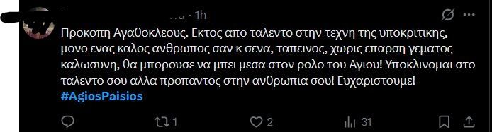 Φέτος και μετά τον δεύτερο κύκλο όπου υποδύεται τον Άγιο Παΐσιο, μία από τις σημαντικότερες μορφές της Ορθοδοξίας, το κύμα αγάπης και θαυμασμού από τον απλό κόσμο αλλά και τους συναδέλφους του, υπήρξε πρωτόγνωρο.