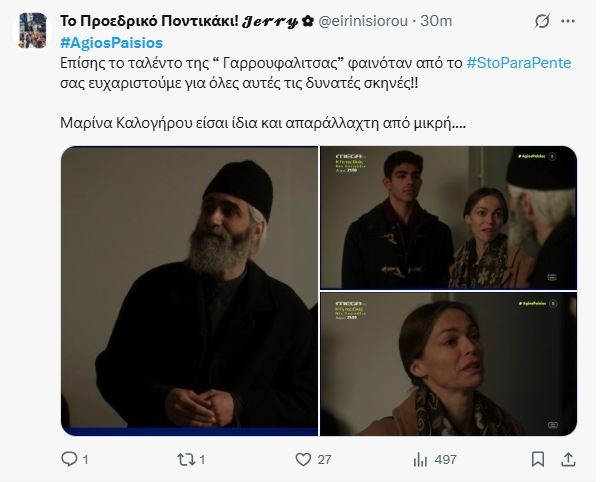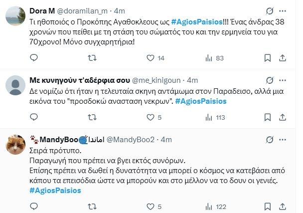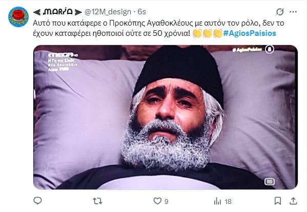 Ο Προκόπης Αγαθοκλέους για μία ακόμη φορά ως Παΐσιος, απέδειξε πως φέτος έκανε τον δυσκολότερο ρόλο με τη μεγαλύτερη επιτυχία, γιατί τον προσέγγισε βαθιά και ουσιαστικά. Το πέρασμα στον Ουρανό αλλά και δύο γυναίκες, η Μαρίνα Καλογήρου και η Κατερίνα Θεοχάρη, σχολιάστηκαν πολύ έντονα στα social media. Ο ηθοποιός αποθεώθηκε για κάθε του κίνηση και βλέμμα και η σειρά έγινε Νο1 trend και σάρωσε στην τηλεθέαση.