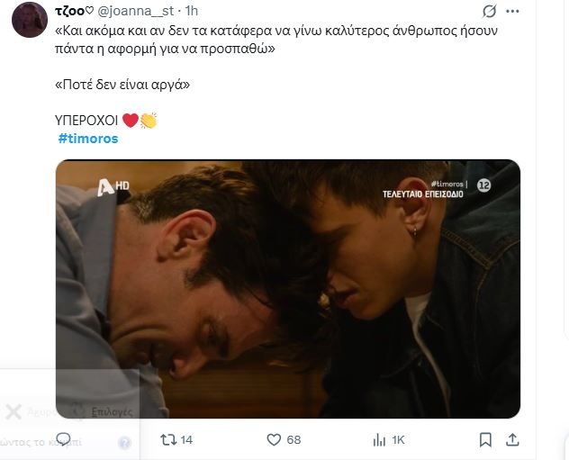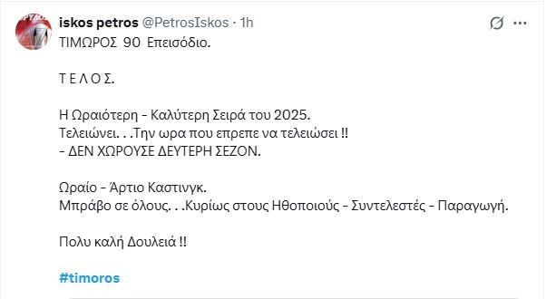Happy end, δικαίωση και λύτρωση είχαμε στον Τιμωρό στο φινάλε του. 2 σκηνές και 3 ηθοποιοί (Δημήτρης Λάλος, Λάζαρος Γεωργακόπουλος και Οδυσσέας Παπασπηλιόπουλος) ανέβασαν ψηλά το επίπεδο της σειράς ακόμη και στο τέλος της.