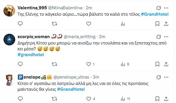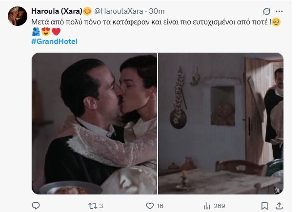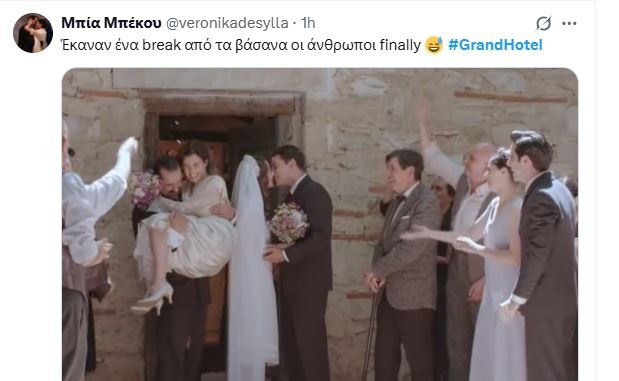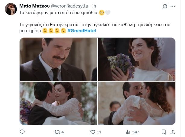 Η μόνη ευχάριστη νότα στο χθεσινό επεισόδιο του Grand Hotel ήταν οι δύο παράλληλοι γάμοι, ο ένας που έγινε μετά από πολλές αναβολές και δυστυχίες για τον Χαραλάμπη και τη Θεώνη αλλά και για το δεύτερο ζευγάρι της σειράς, τον Βαγγέλη και την Πελαγία. Χρειαζόμασταν μία γλυκιά στιγμή, ανάμεσα στις τραγικές και δραματικές.
