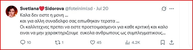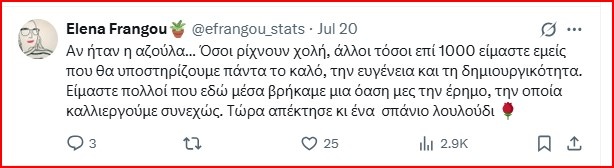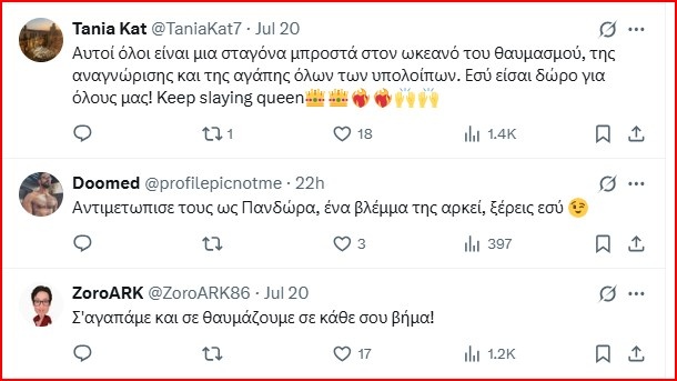 Ήρθε όμως η στιγμή μετά το φινάλε, να μιλήσει για αυτό που έζησε. Με ένα πολύ χαρακτηριστικό tweet ευχαριστώντας τους χρήστες του Χ που τις περισσότερες φορές στάθηκαν στο πλάι της, ενώ όλα ήταν γεμάτα κακία, αδικία και συμπλέγματα.