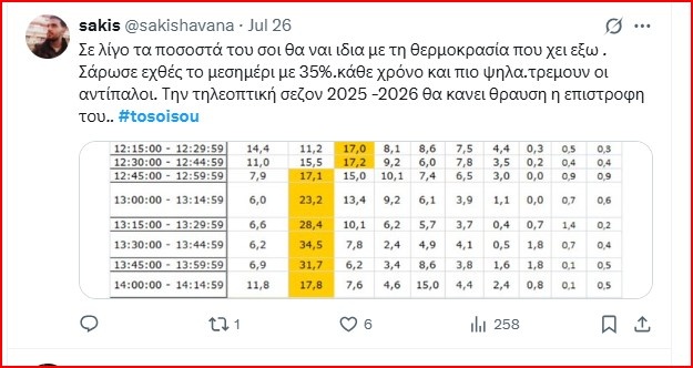 Μία ματιά στα νούμερα τηλεθέασης των τελευταίων ημερών, δικαιολογεί για μία ακόμη φορά τη μεγάλη και διαχρονική επιτυχία που έχει η σειρά το Σόι σου. Όπως και όλο το χειμώνα με τη διπλή καθημερινή επανάληψή της, όπως και τώρα το καλοκαίρι, η σειρά αγγίζει και ξεπερνά πολλές φορές το 30% τόσο στο δυναμικό όσο και στο γενικό σύνολο.