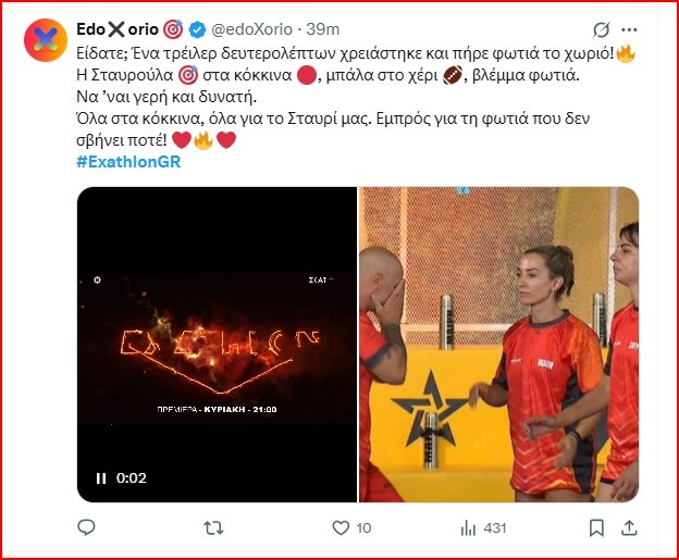 Επιγκεντρωμένο περισσότερο στον παρουσιαστή Γιώργο Καράβα ήταν το πρώτο τρέιλερ στο Exathlon και ήταν φυσικό καθώς για πρώτη φορά δοκιμάζεται σε αυτόν τον ρόλο.