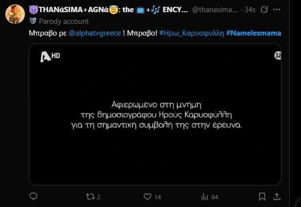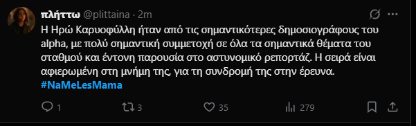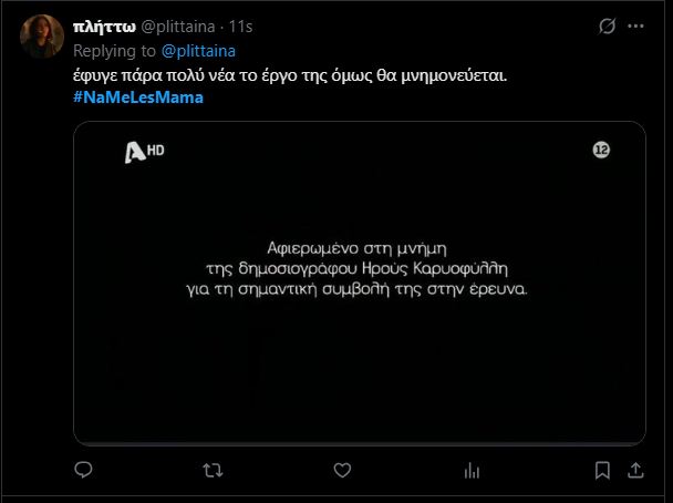 Συγκινητική ήταν και η αφιέρωση της σειράς στη συνάδελφο Ηρώ Καριοφύλλη που «έφυγε» από τη ζωή πριν από μερικούς μήνες. Είχαμε και εμείς συγκινηθεί όταν είδαμε το όνομά της στη δημοσιογραφική προβολή στους τίτλους τέλους.