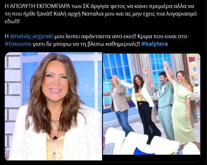 Με αυτό το μοτίβο, λοιπόν, η εκπομπή «Καλύτερα δε Γίνεται» είπε το «καλή νέα σεζόν» για 8η φορά με τη Ναταλία Αργυράκη τη μόνη απουσία, από δική της επιλογή, όπως είναι γνωστό καθώς η δημοσιογράφος θέλησε να έχει τα Σαββατοκύριακά της ελεύθερα, όπως είπε δημόσια και μεταφέρθηκε στην καθημερινή παρέα του Κώστα Τσουρού.