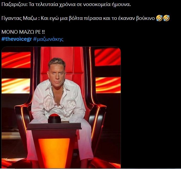 Αυτό που ακολούθησε αμέσως μετά, όμως ήταν κάτι που μόνο ο «Μαζώ» θα μπορούσε να κάνει καθώς κράτησε την τελευταία κουβέντα της Έλενας που είπε πως «τον τελευταίο χρόνο είμαι συνέχεια στα νοσοκομεία» και έδωσε την ατάκα της βραδιάς αναφερόμενος, προφανώς στη δική του πρόσφατη περιπέτεια.