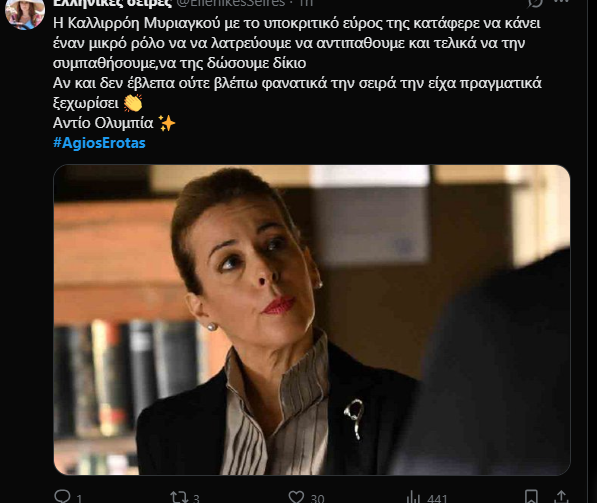 Μετά την Ματίνα Μανταρινάκη στο Κωνσταντίνου και Ελένης, ήταν ο δεύτερος τηλεοπτικός ρόλος της Καλλιρρόης Μυριαγκού που έκανε αίσθηση στο κοινό. Ως Ολυμπία στον Άγιο Έρωτα, έγινε ακόμη πιο συμπαθής λίγο πριν τον θάνατό της.