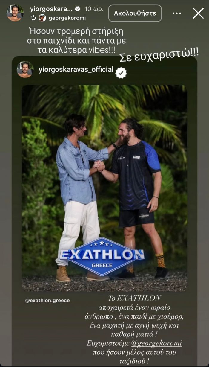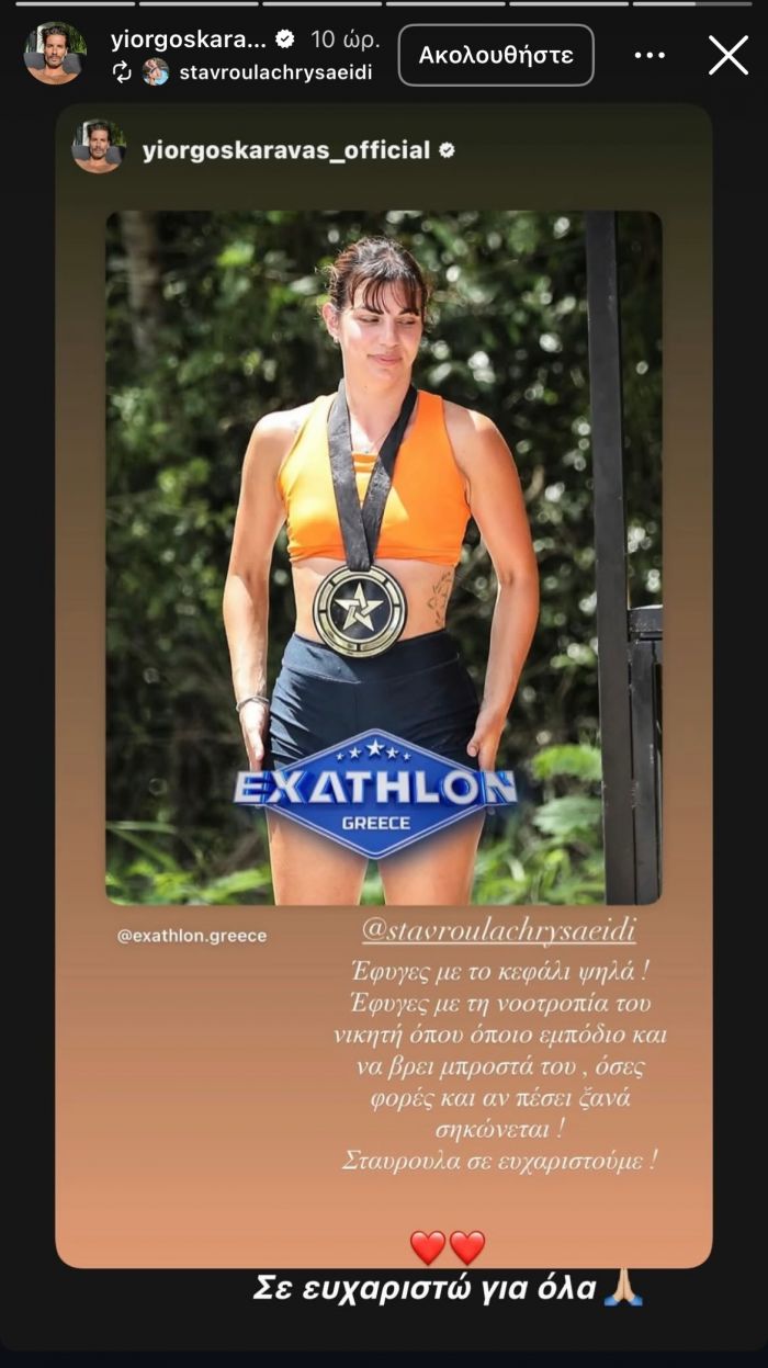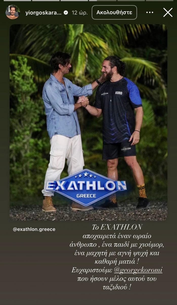 «Έφυγες με το κεφάλι ψηλά. Έφυγες με τη νοοτροπία του νικητή, όπου όποιο εμπόδιο κι αν βρει μπροστά του, όσες φορές κι αν πέσει ξανά σηκώνεται. Σταυρούλα σε ευχαριστούμε», έγραψε αρχικά ο Γιώργος Καράβας για την Χρυσαειδή και στη συνέχεια έγραψε για τον Κόρομι: «Το Exathlon αποχαιρετά έναν ωραίο άνθρωπο, ένα παιδί με χιούμορ, έναν μαχητή με αγνή ψυχή και καθαρή ματιά».