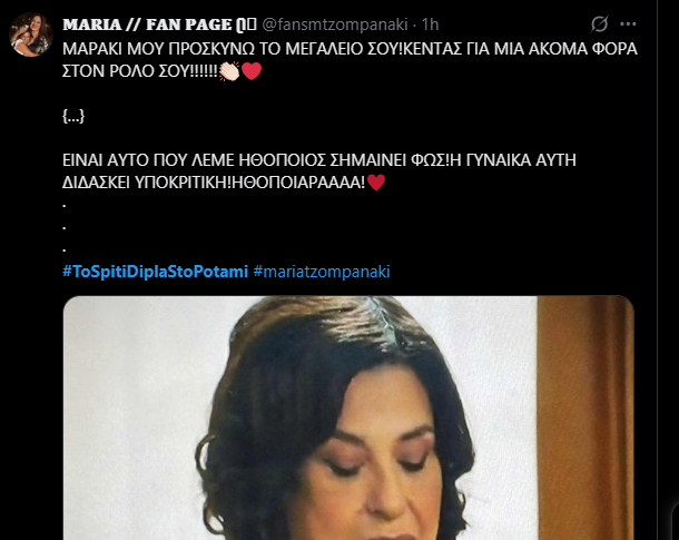 Η Μαρία Τζομπανάκη είναι είδωλο στον ρόλο της ως δολοπλόκα πεθερά που δεν αρκείται σε απλές μηχανοραφίες. Οργανώνει και δύσκολα σχέδια. Πήραμε μία γεύση από το επόμενο επεισόδιο που θα κοντραριστεί και πάλι με τη νύφη της που καθ' υπόδειξη της θείας του Φωκά της φέρνει αντίσταση.