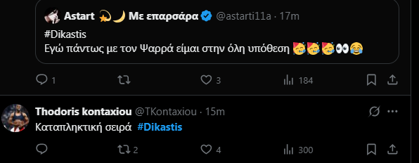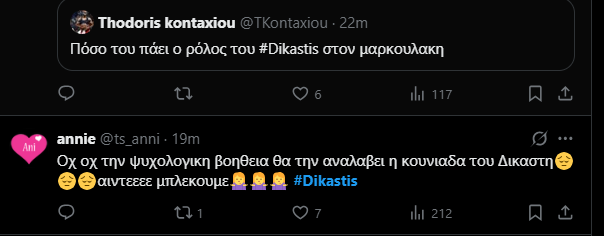Το κοινό στο Χ ενθουσιάστηκε και μάλιστα ξεχώρισε το πρωταγωνιστικό δίδυμο, Μαρκουλάκη - Ψαρρά που για πρώτη φορά τους βλέπουμε μαζί σε σειρά.