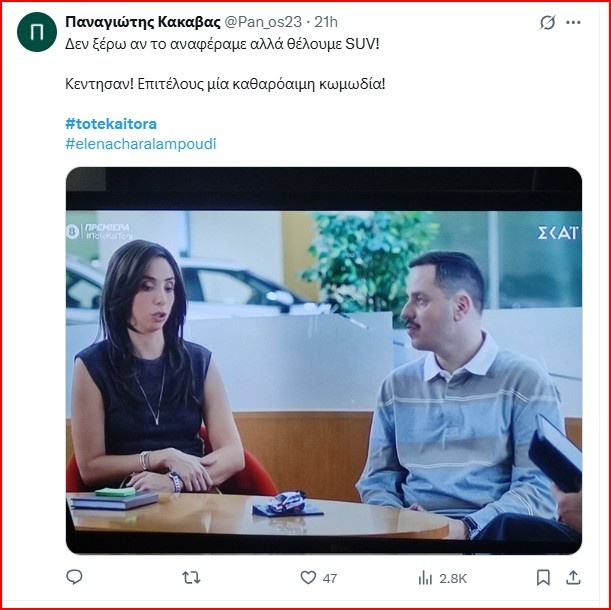 Η Σούλα και ο Τάκης από το ΤΟΤΕ, ο Σπύρος και η Βαλέρια στο ΤΩΡΑ έκαναν την εμφάνισή τους στην τηλεόραση και στο 1ο επεισόδιο πήγαν για «Αγορά Αυτοκινήτου» με guest star, στον ρόλο του πωλητή, τον Λαέρτη Μαλκότση, ο οποίος μας έδειξε για μία ακόμη φορά πως είναι το ίδιο ταλαντούχος και σε δραματικούς αλλά και κωμικούς ρόλους.