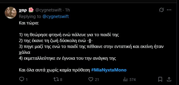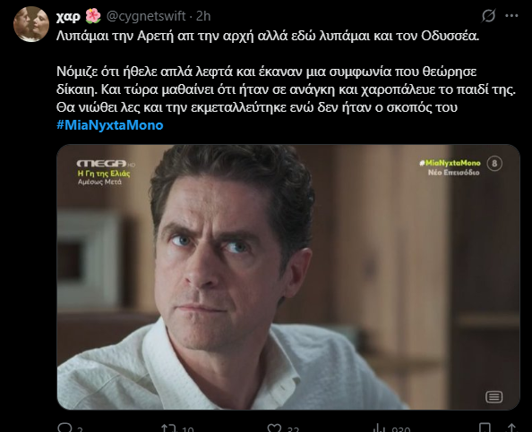 Βέβαια εκείνη αναμένει την απόλυσή της γιατί δεν είχε αποκαλύψει πως είναι μητέρα. Ο Οδυσσέας όμως όχι μόνο δεν θα την απολύσει αλλά θα τη θαυμάσει ακόμη περισσότερο. Στο Χ ήδη τον συμπονούν για τις τύψεις του αλλά προέβλεψαν και προβληματίστηκαν για κάτι που πραγματικά θα συμβεί στο μέλλον.