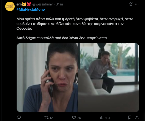 Ο Οδυσσέας θα τρελαθεί από την αγωνία του και η Αρετή θα τον ερωτευτεί ακόμη περισσότερο ζητώντας τη βοήθειά του στο νοσοκομείο. Στο Χ ήδη έχουν ενθουσιαστεί με τα πρώτα πλάνα από το τρέιλερ του επεισοδίου της Κυριακής.