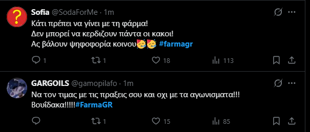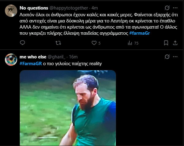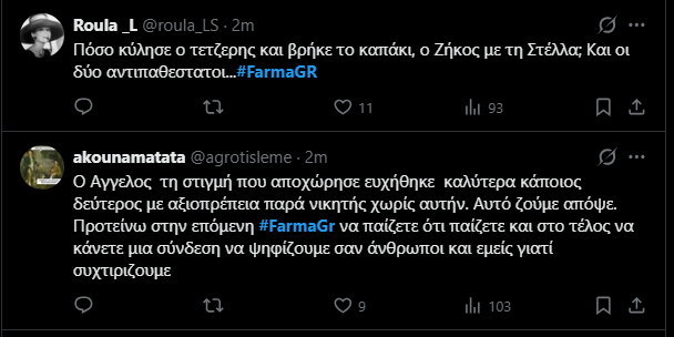 Δεν παρέλειψε όμως να ευχαριστήσει τη Στέλλα και τον Γιώργη Ανυφαντάκη: «Αν δεν ήταν αυτοί σε κάποια στιγμή εδώ μέσα θα εία σπάσει θα είχα φύγει. Η Φάρμα για εμένα ήταν ένα πολύ μεγάλο σχολείο, μία τεράστια πρόκληση. Κρατάω ότι θα πρέπει να ελέγξω λίγο το νευρικό μου σύστημα, να μην ταράζομαι τόσο εύκολα και να δουλέψω πάνω στην οξύθυμη πλευρά μου».