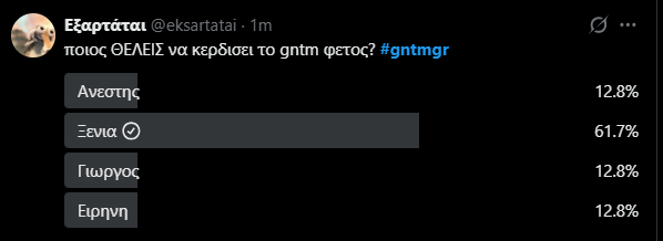 Και οι δύο δείχνουν να είναι τα μεγάλα φαβορί για τον σημερινό τελικό. Θα μας κάνει όντως μεγάλη έκπληξη αν δούμε κάτι διαφορετικό. Επειδή μάλιστα ψηφίζει το κοινό - και ο Ανέστης δεν είναι αγαπητός λόγω της μικρής του έπαρσης - μπορεί να δούμε και την Ξένια να φτάνει ψηλά. Όλα όμως θα εξαρτηθούν από τις σημερινές 2 δοκιμασίες του τελικού. Όλα παίζονται.