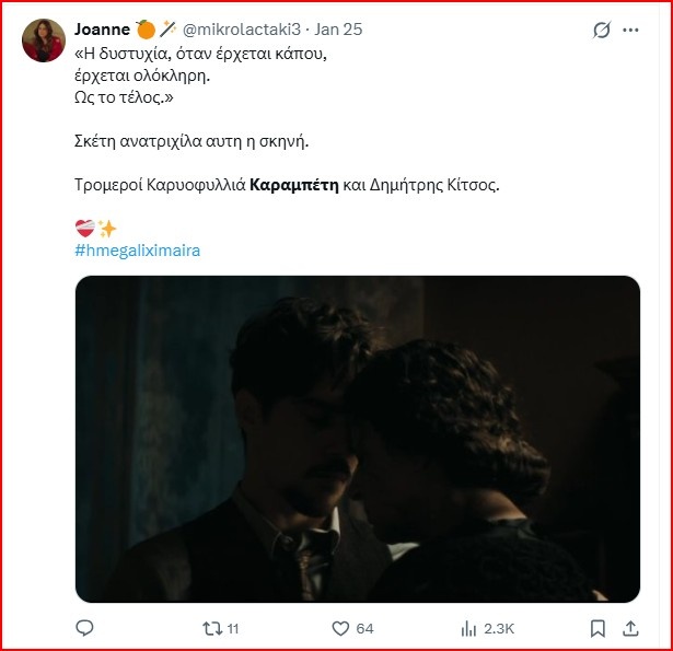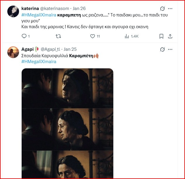Πολυσυζητημένη αυτή η μεγάλη παραγωγή για πολλούς λόγους που επανέφερε ακόμη και λογοτεχνικές συζητήσεις για εν πολλοίς, αμφιλεγόμενο έργο του Μ. Καραγάτση. Ο επίλογος είναι τραγικός. Και είναι ευκαιρία για να θαυμάσουμε το υποκριτικό εύρος των σπουδαίων ηθοποιών της σειράς. Τρία πρόσωπα, η Καρυοφυλλιά Καραμπέτη, ο Ανδρέας Κωνσταντίνου και η Φωτεινή Πελούζο ενώνονται σε μία κοινή μοίρα.