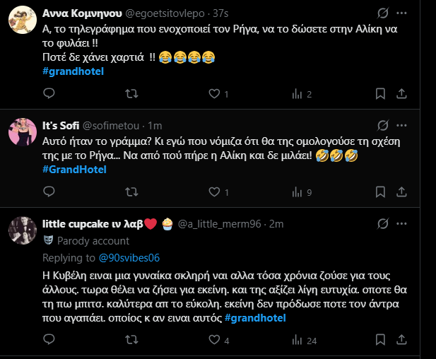 Όλα φυσικά θα καταστραφούν με τη σημερινή σύλληψη του Ρήγα και την απεγνωσμένη προσπάθεια της Κυβέλης να προλάβει την Αλίκη από το να διαβάσει το γράμμα. Όχι μόνο αποτυγχάνει, αλλά θα δει την κόρη της στη θέση της στο ξενοδοχείο. Και θα καταλάβει πόσο πολύ τελικά της μοιάζει στον χαρακτήρα.