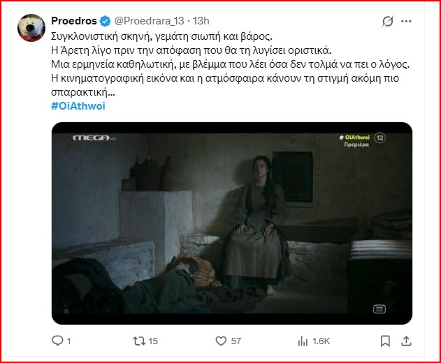 Η σειρά του Mega ξαναθύμησε την παλιά καλή ελληνική τηλεόραση που λειτουργεί με κινηματογραφικές προδιαγραφές και στην πιο μικρή λεπτομέρεια. Συγκλονιστική υπήρξε η ερμηνεία της Αμαλίας Καβάλη ως Αρετή, πριν δούμε στη σειρά τη Χριστίνα Χειλά Φαμέλη και πέτρα του σκανδάλου.