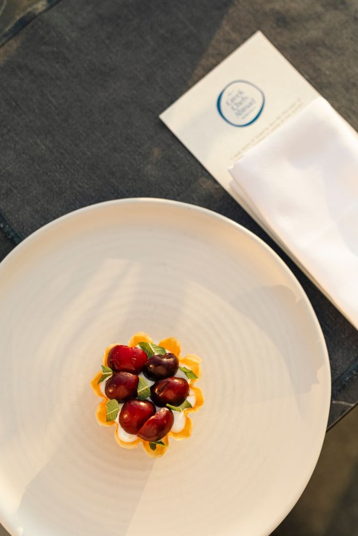 Από τα στρείδια με παγωμένο πεπόνι και lime, τις τομάτες με φράουλες και γύρη, το μυλοκόπι με άγρια βότανα και το καραμελωμένο χοιρινό μέχρι την υπέροχη τάρτα με γιαούρτι, κεράσι και φιστίκι που ήρθε ως ορεκτικό, όλα τα πιάτα είχαν το «κατάλληλο» συνοδευτικό κρασί από το οινοποιείο Ζέρβα, στον Παραπόταμο. Η βραδιά ήταν γεμάτη αγάπη για την ίδια την ουσία του φαγητού, μία σύμπραξη ανάμεσα σε δύο χώρες κάτω από μία «στέγη» που είναι ο ορισμός του luxury hospitality στην Πάργα.