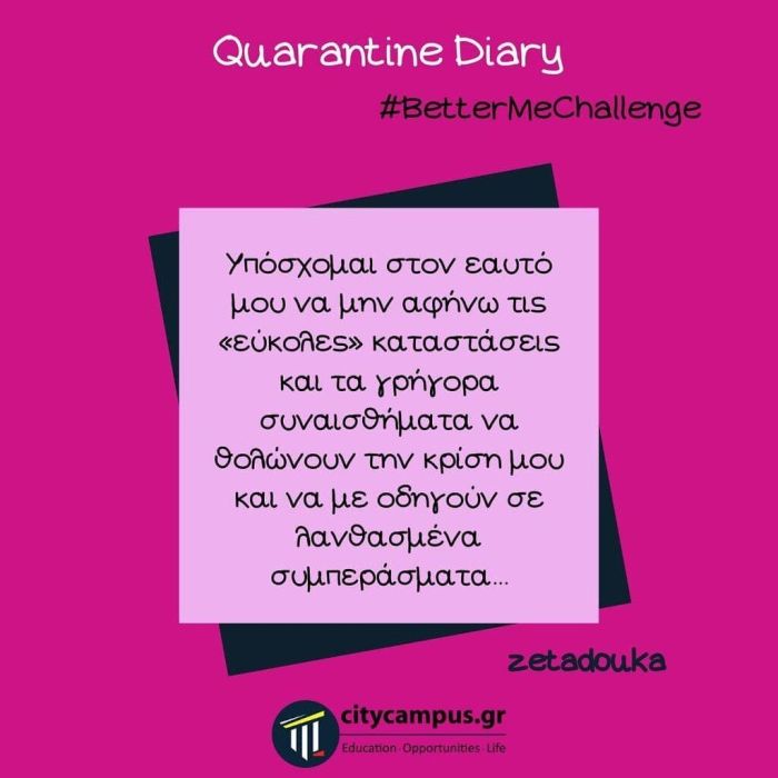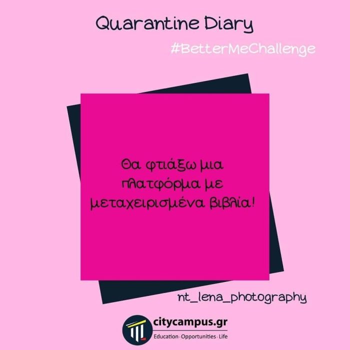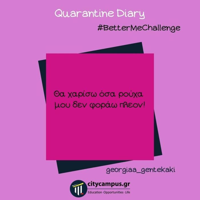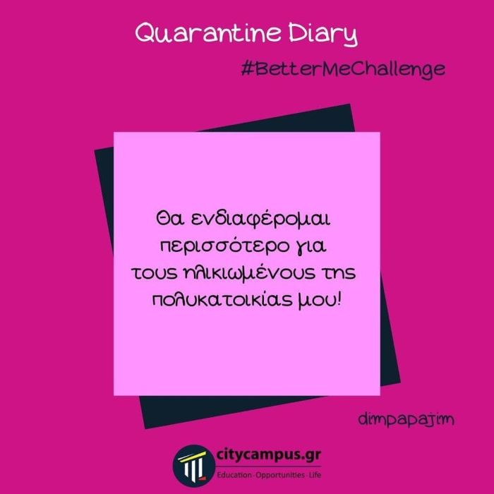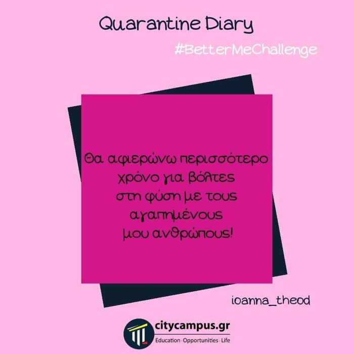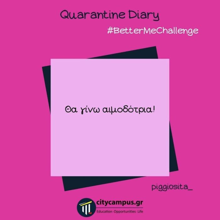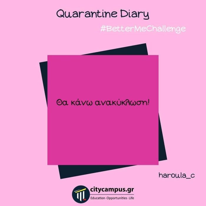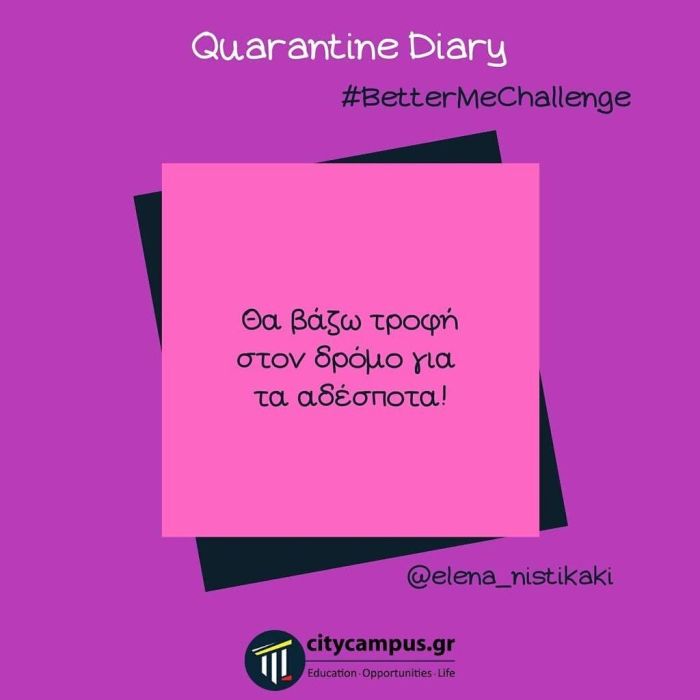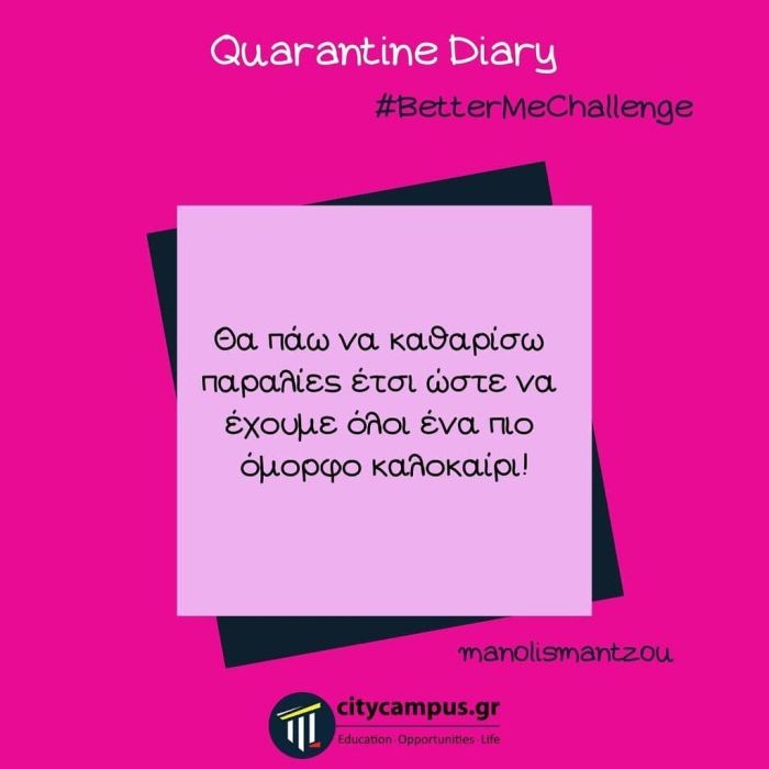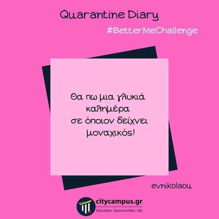 Το Citycampus πάντως ξεκίνησε κάτι ιδιοφυές. Μέσα από το account τους στο instagram, παρακινούν τους followers τους να ξεκινήσουν ένα challenge για καλό σκοπό. Με το hashtag «BetterMeChallenge», οι ακόλουθοι καλούνται να γράψουν την καλή πράξη που θα κάνουν μετά την καραντίνα.
