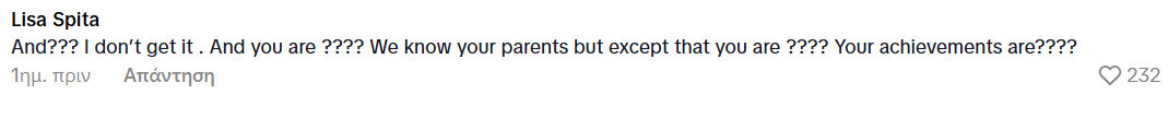«Και; Δεν το καταλαβαίνω. Εσύ ποια είσαι; Ξέρουμε τους γονείς σου αλλά εκτός απ' αυτό, εσύ είσαι ποια ακριβώς; Ποια είναι τα επιτεύγματά σου;», σχολίασε κάποιος.