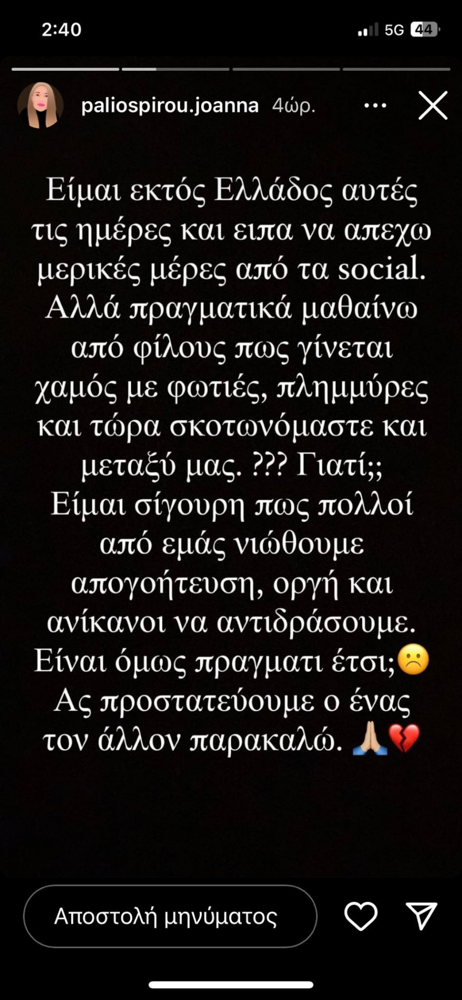 Η Ιωάννα Παλιοσπύρου, δημοσίευσε ένα μαύρο φόντο σε story με αφορμή αυτή την δυσάρεστη είδηση, επισημαίνοντας ότι «Είμαι εκτός Ελλάδος αυτές τις μέρες και είπα να απέχω μερικές μέρες από τα social. Αλλά πραγματικά μαθαίνω από φίλους πως γίνεται χαμός με φωτιές, πλημμύρες και τώρα σκοτωνόμαστε και μεταξύ μας??? Γιατί;; Είμαι σίγουρη πως πολλοί από εμάς νιώθουμε απογοήτευση, οργή και ανίκανοι να αντιδράσουμε. Είναι, όμως πράγματι έτσι; Ας προστατεύσουμε ο ένας τον άλλον παρακαλώ», δείχνοντας με αυτόν τον τρόπο την αγανάκτηση και την στεναχώρια της για το θλιβερό περιστατικό.