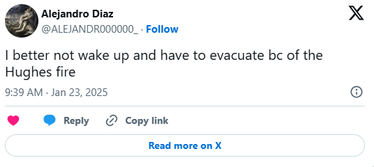 Παρά το γεγονός πως η φωτιά Hughes δεν έχει πάρει μεγάλη έκταση, κάτοικοι κοντά στην περιοχή που εκδηλώθηκε η πυρκαγιά έσπευσαν να εκκενώσουν τις κατοικίες τους, όπως έδειξαν τοπικά δελτία ειδήσεων, ενώ άλλοι προσπάθησαν να σώσουν ό,τι μπορούσαν, ρίχνοντας νερό στα σπίτια και τους κήπους. Συνολικά, περίπου 31.000 άνθρωποι στην περιοχή βρίσκονται υπό υποχρεωτική εντολή εκκένωσης και άλλοι 23.000 έχουν ειδοποιηθεί ότι μπορεί να χρειαστεί να φύγουν, σύμφωνα με τις Αρχές, ενώ μια φυλακή στην περιοχή εκκένωσε σχεδόν 500 κρατούμενους στις εγκαταστάσεις της.