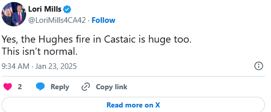 Ωστόσο, η φωτιά Hughes είναι «ένα τελείως διαφορετικό τέρας» σε σχέση με τις πυρκαγιές Palisades και Eaton, δήλωσε την Πέμπτη η αρχηγός της πυροσβεστικής υπηρεσίας της κομητείας του Λος Άντζελες, Sheila Kelliher, στο CNN. Πριν από δύο εβδομάδες, οι πυροσβέστες αντιμετώπισαν ακραίες προκλήσεις καθώς οι ισχυροί άνεμοι καθήλωσαν την εναέρια βοήθεια.
