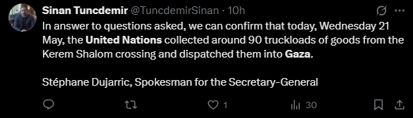 Παρόλα αυτά, εξέφρασε την ελπίδα ότι τα πρώτα φορτηγά θα καταφέρουν να μεταφέρουν τα αγαθά στις αποθήκες του ΟΗΕ πριν αυτά διανεμηθούν στον πληθυσμό της Γάζας, ο οποίος βρίσκεται υπό σοβαρό κίνδυνο λιμού.